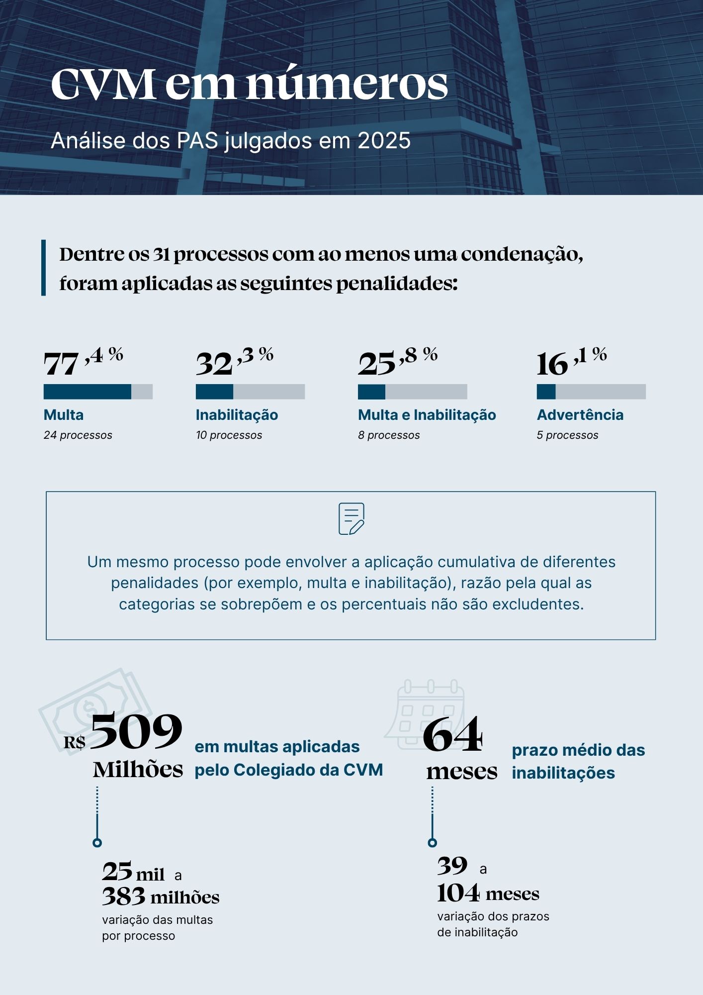 Na nova edição da série “CVM em números: análise dos PAS julgados em 2025”, na qual reunimos e analisamos dados públicos sobre os julgamentos sancionadores da Comissão, analisamos as penalidades aplicadas pelo Colegiado ao longo do último ano.